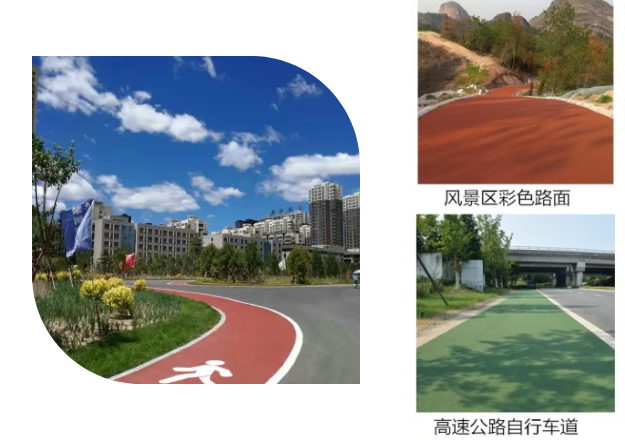 公园景观绿道、小区道路等都可以铺筑彩色防滑路面,施工24小时后即可开放交通,颜色呈现均匀靓丽,