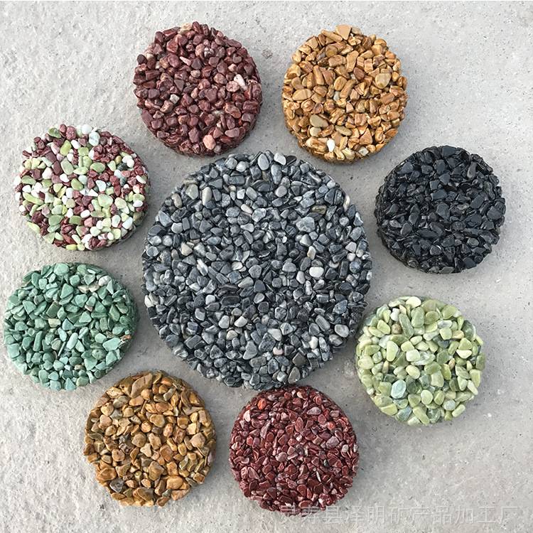 胶粘石常用的骨料种类包括天然彩色卵石、破碎石、玻璃骨料、夜光石、彩色陶瓷颗粒、天然彩砂等。